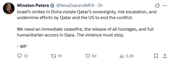 PSNA says Winston Peters must immediately and thoroughly condemn Israel’s bombing on the Qatari capital Doha.
